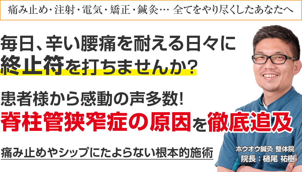 もしあなた様が今、上記のような事をお悩みで、少しでも良くなりたい!と思われているなら、ホウオウ鍼灸治療院に来院し、そのつらい脊柱管狭窄症を根本から改善しませんか?