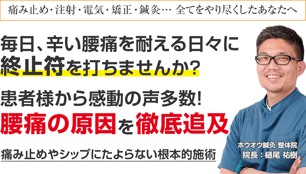 もしあなた様が今、上記のような事をお悩みで、少しでも良くなりたい!と思われているなら、ホウオウ鍼灸治療院に来院し、そのつらい腰痛を根本から改善しませんか?